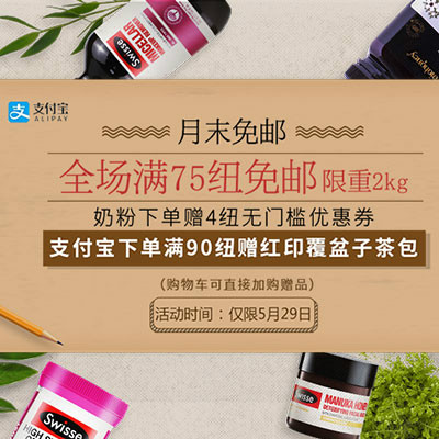 活动内容:新西兰PD药房支付宝日X月末免邮,全场满75纽免邮,支付宝下单满90纽赠红印覆盆子茶包,奶粉下单送4纽无门槛券。...