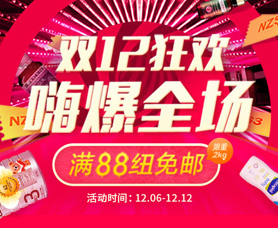 活动主题:双12狂欢,嗨爆全场!活动力度:满88纽免邮 限重2.0kg无门槛3纽券*满99减5纽券(奶粉除外)(活动页领取)...