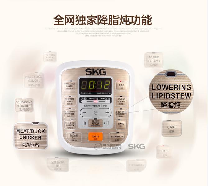SKG2801这款降脂炖电压力锅是全网独家降脂炖,专为高脂人群定制的降脂高压锅,主要通过高温脱脂程序,将食物中的油脂炖出来,从而大大减少人体油脂摄入,...
