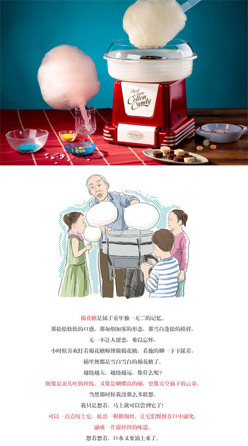 Nostalgia Electrics是一个主要生产复古小家电的品牌,这款棉花糖机额定功率450w。额定电压220v。红白配色加上复古的外观兼具使用价...